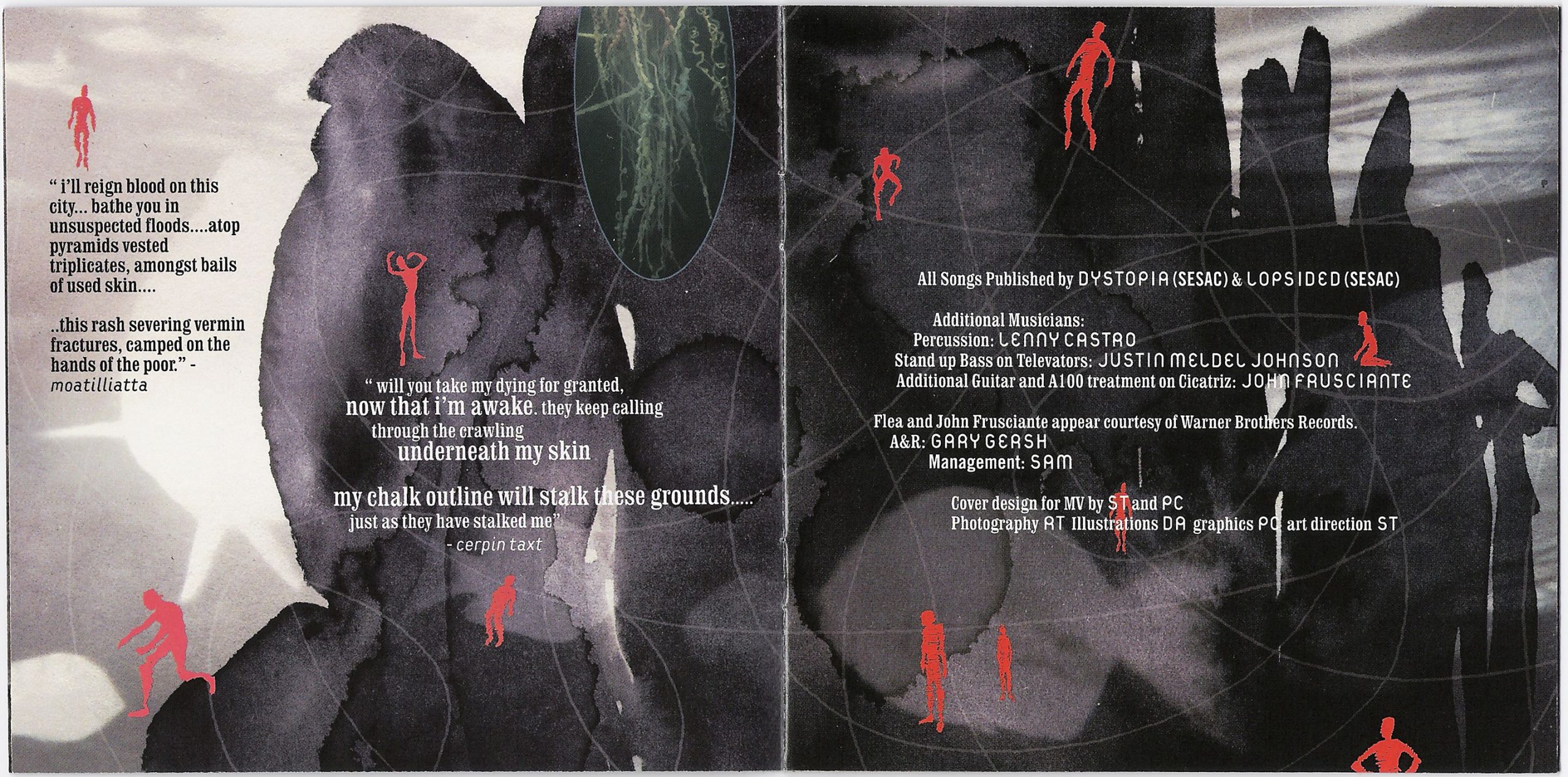 Two songs from the album, “Roulette Dares (The Haunt Of)” and “Cicatriz ESP,” first appeared in 2001 as the band’s very first demo recordings with bassist Eva Gardner and drummer Blake Fleming; notably, the early version of “Cicatriz ESP” (then known as “Cicatrix”) was slower and much shorter (4 minutes) than the album one (at 12 minutes being the longest track on the album).