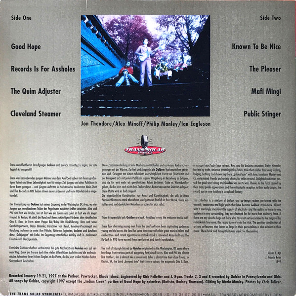 Recorded January 19-21, 1997 at the Parlour, Pawtucket, Rhode Island. Tracks A2, A3 and B4 recorded [...] in Pennsylvania and Ohio. All songs by Golde...