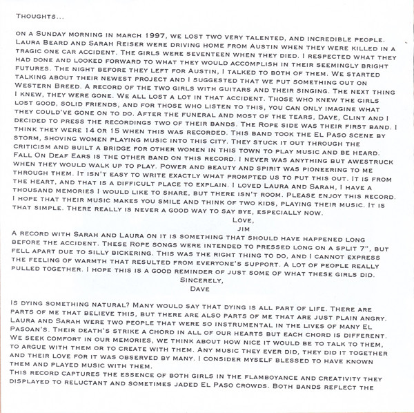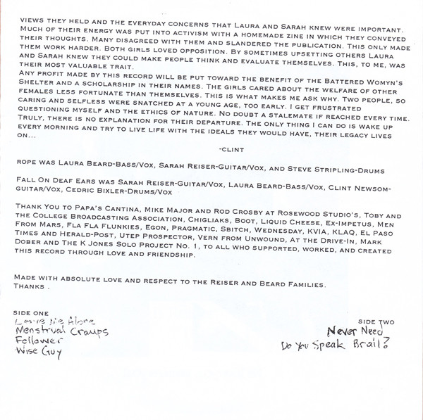 Side A (tracks 1-4) are songs from Sarah and Lauren’s first band, Rope.  Side B (tracks 5-6) were from their band which featured Cedric Bixler-Zavala, The Fall on Deaf Ears