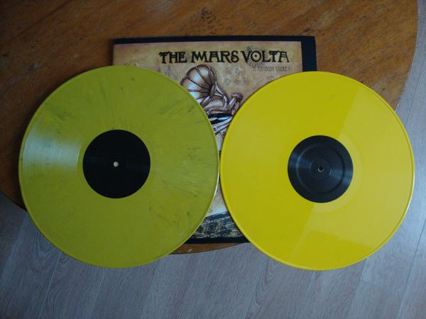 Housed in a black cardboard sleeve with folded cover. Plain black labels. Yellow marble vinyl.