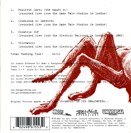 The Mars Volta repackaged the live EP and re-released it included with the Tour Edition release of De-Loused in the Comatorium, as well as an Australian-only single for “Televators” in January, 2004, coinciding with their tour with the Big Day Out. It features the studio version of “Televators”, and then the same four live tracks.