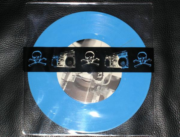 Limited Edition Split 7" in a clear plastic sleeve with a skull & crossbones and boombox banner on the front side.