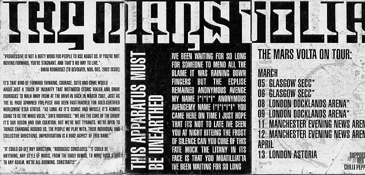 To describe the touring era of De-Loused in the Comatorium is to write a novel of a band continually morphing and shape-shifting from mutant punk to space oddity salsa; a span of three years that had the band go through a head-spinning multitude of personnel changes, nearly endless touring, the death of a founding member, see the band skyrocket from barroom novelty to playing to massive festival going audienc... read more
